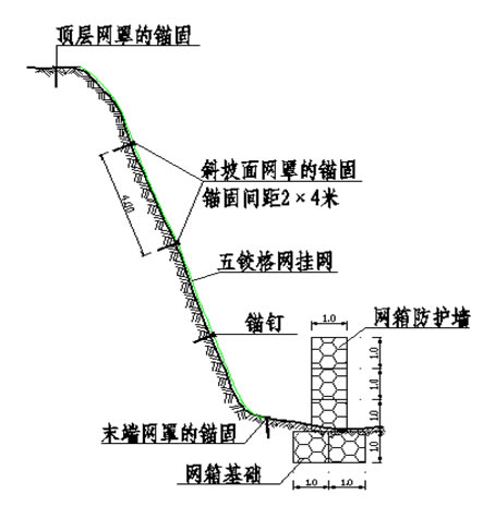 在有些不穩(wěn)定的巖質(zhì)山坡下的建筑物存在地質(zhì)威脅,為了減小原來巖質(zhì)山坡對建筑和一些設(shè)施的潛在威脅,需要對巖質(zhì)山坡進(jìn)行防護(hù)。在滿足工程需要的情況下考慮到與環(huán)境生態(tài)的效果。在有巖石突出的山坡下面采用擋墻形式。石頭可以就近取材,生態(tài)石籠網(wǎng)采用高鍍鋅鋼絲外包PVC材料,PVC覆層采用灰色以便與環(huán)境相和諧。山坡下的網(wǎng)箱結(jié)構(gòu)可以有效阻擋突出巖石山坡落下的碎石和滑土,同時(shí)格網(wǎng)結(jié)構(gòu)就近取石材,結(jié)構(gòu)與環(huán)境融為一體。生態(tài)格賓網(wǎng)結(jié)構(gòu)對基礎(chǔ)要求不高,而且便于施工,施工速度快,造價(jià)低。安裝過程中將多個(gè)網(wǎng)箱或網(wǎng)墊綁扎在一起,形成一個(gè)均勻的結(jié)構(gòu),整體性好,能抵擋落石對擋墻結(jié)構(gòu)的沖擊。
